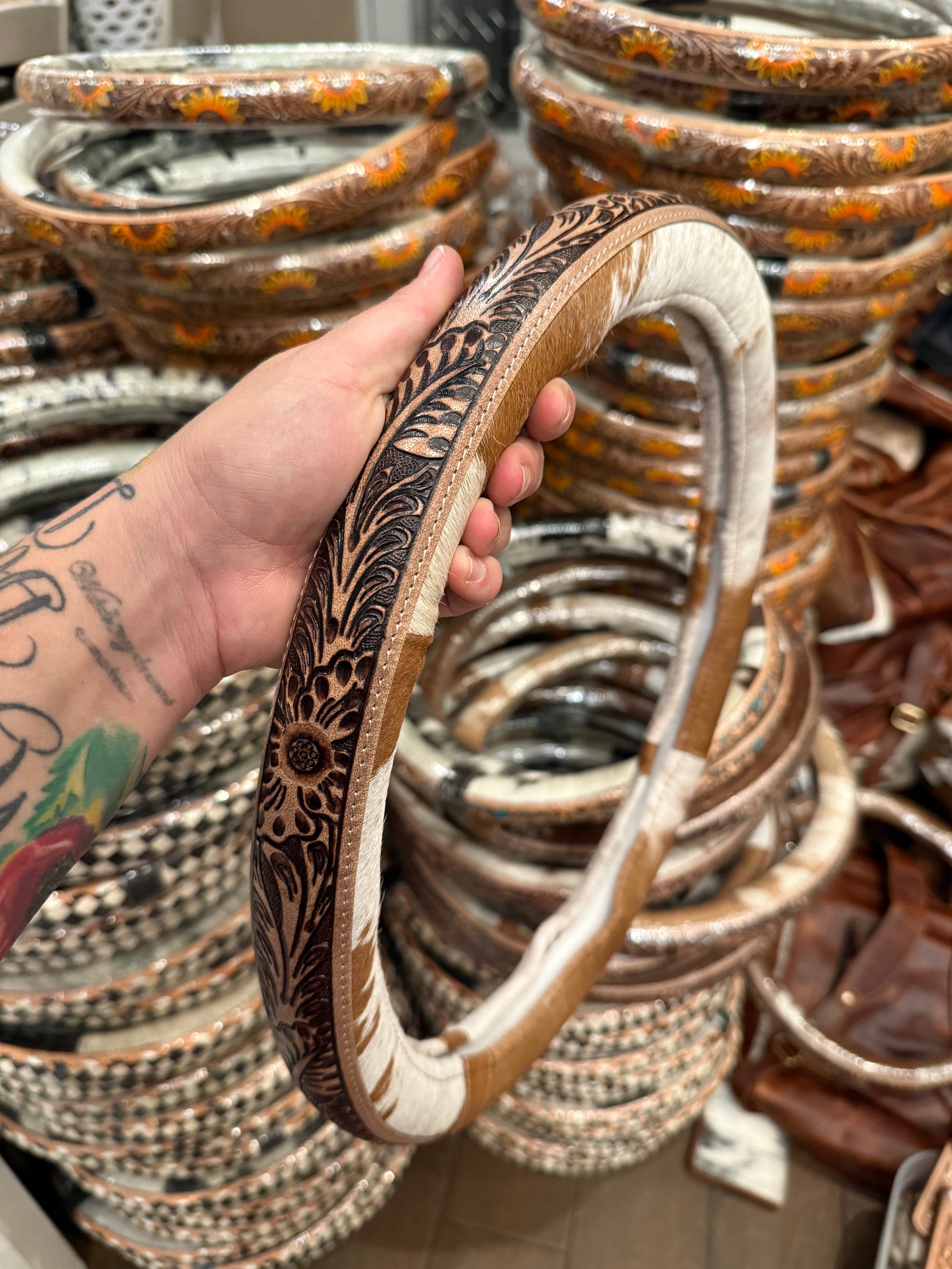 Upgrade your ride with a premium cowhide tooled leather steering wheel cover. Handcrafted with genuine cowhide leather, this cover adds both durability and a classic western style to your steering wheel. Designed to fit 15.25-inch steering wheels, it provides a snug and secure fit while elevating the look and feel of your vehicle's interior.