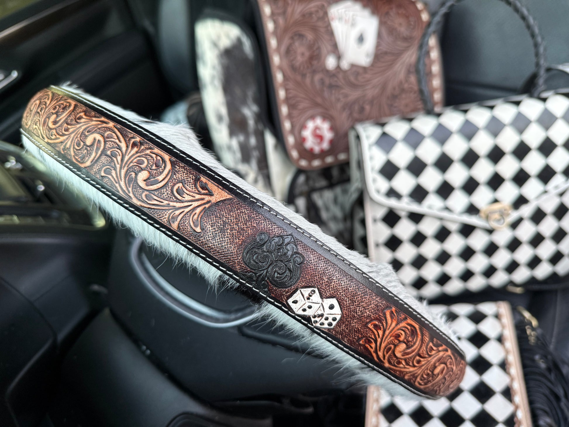 Bring rugged elegance to your vehicle with this one-of-a-kind cowhide leather steering wheel cover!