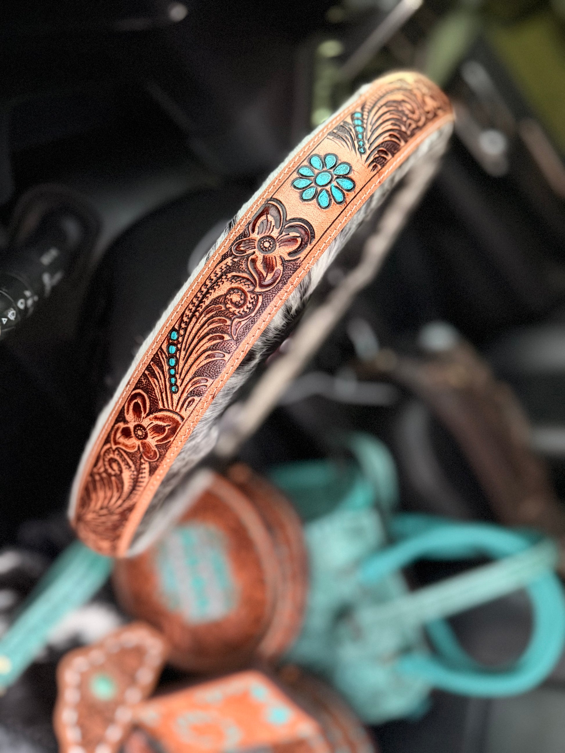 Upgrade your ride with a premium cowhide tooled leather steering wheel cover. Handcrafted with genuine cowhide leather, this cover adds both durability and a classic western style to your steering wheel. Designed to fit 15”-15.25-inch steering wheels, it provides a snug and secure fit while elevating the look and feel of your vehicle's interior.