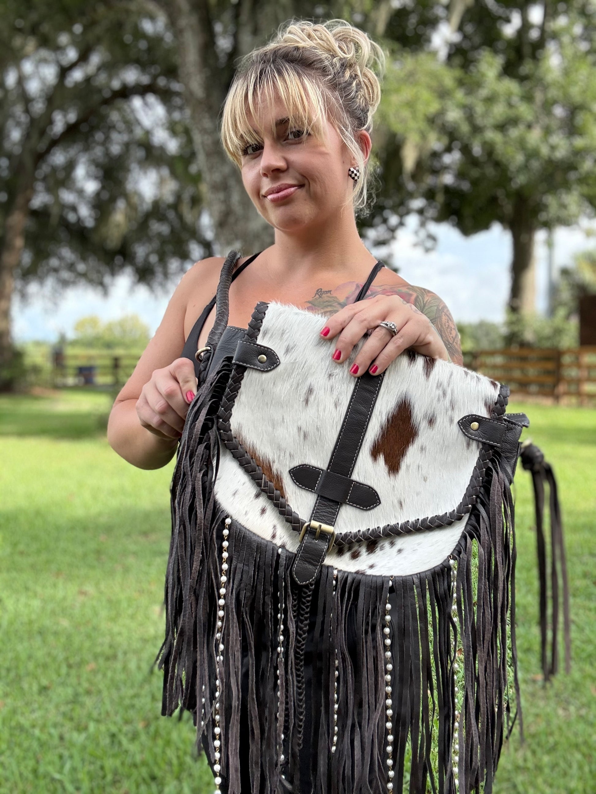 Cowhide beaded braided purse