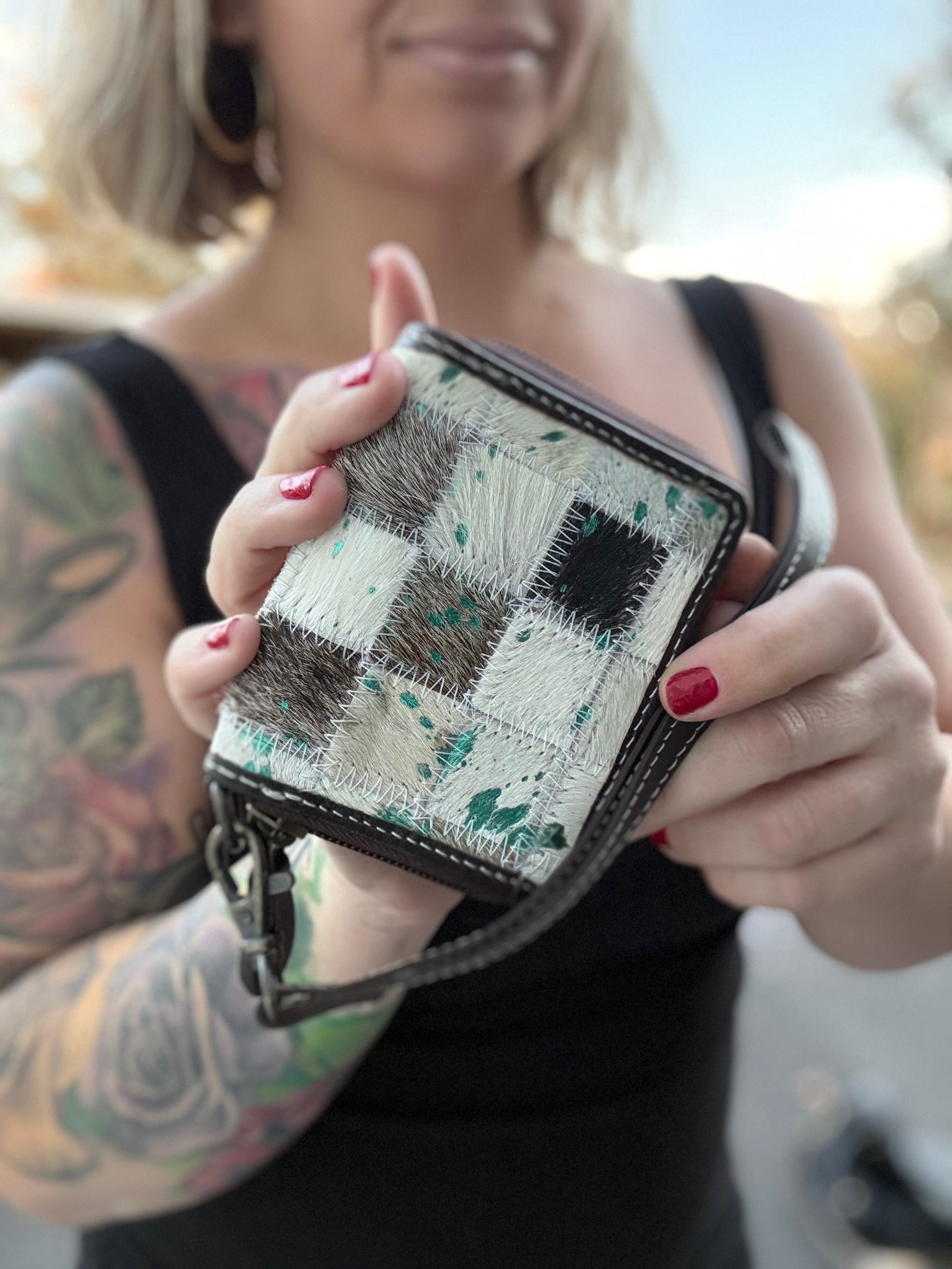 Mini teal checker print BLUE acid wash cowhide wallet