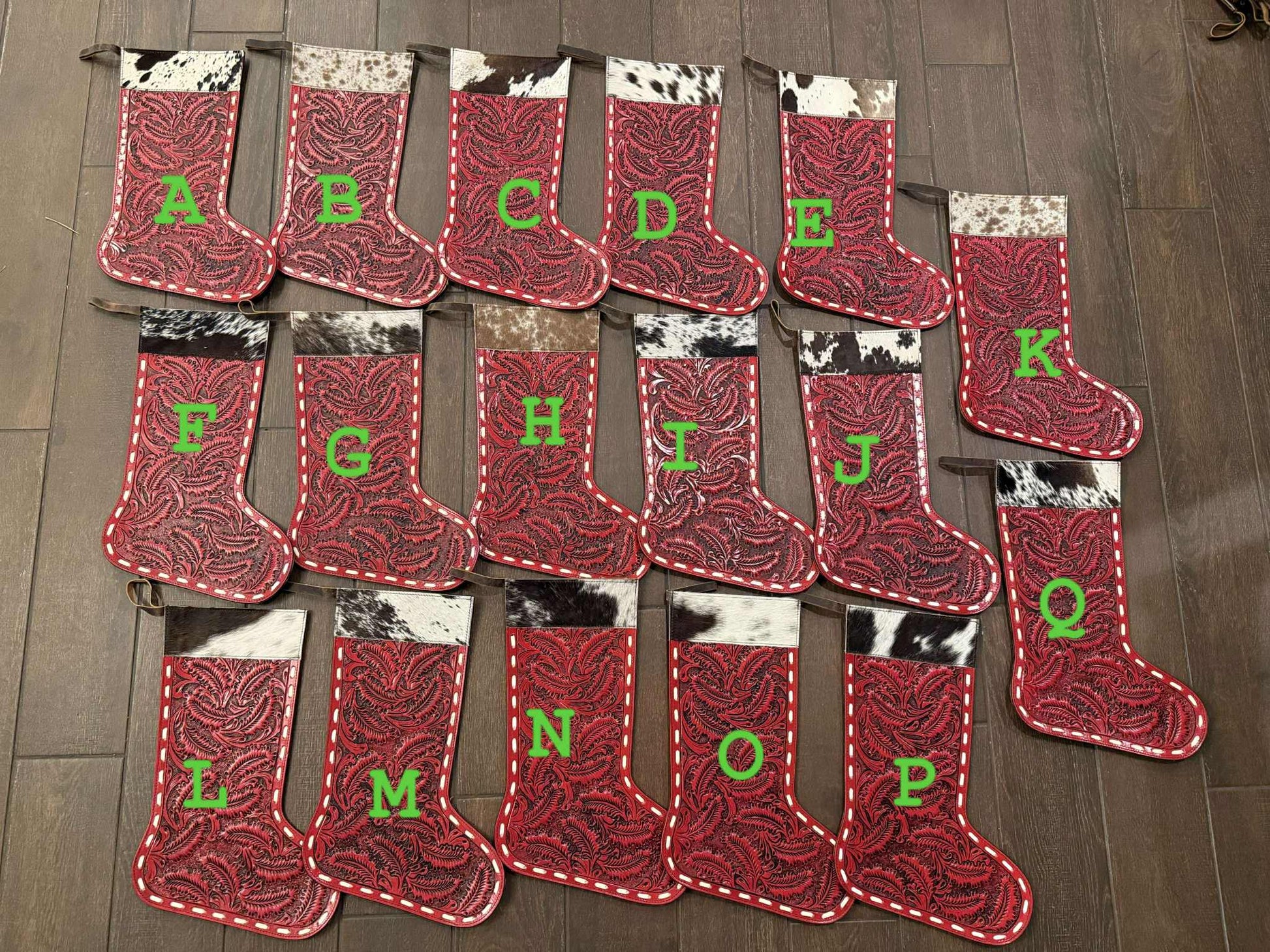Stunning red tooled leather and cowhide stocking that brings sophisticated western elegance to your Christmas celebration. The beautiful red tooled leather detailing combined with genuine cowhide creates a truly unique holiday piece.