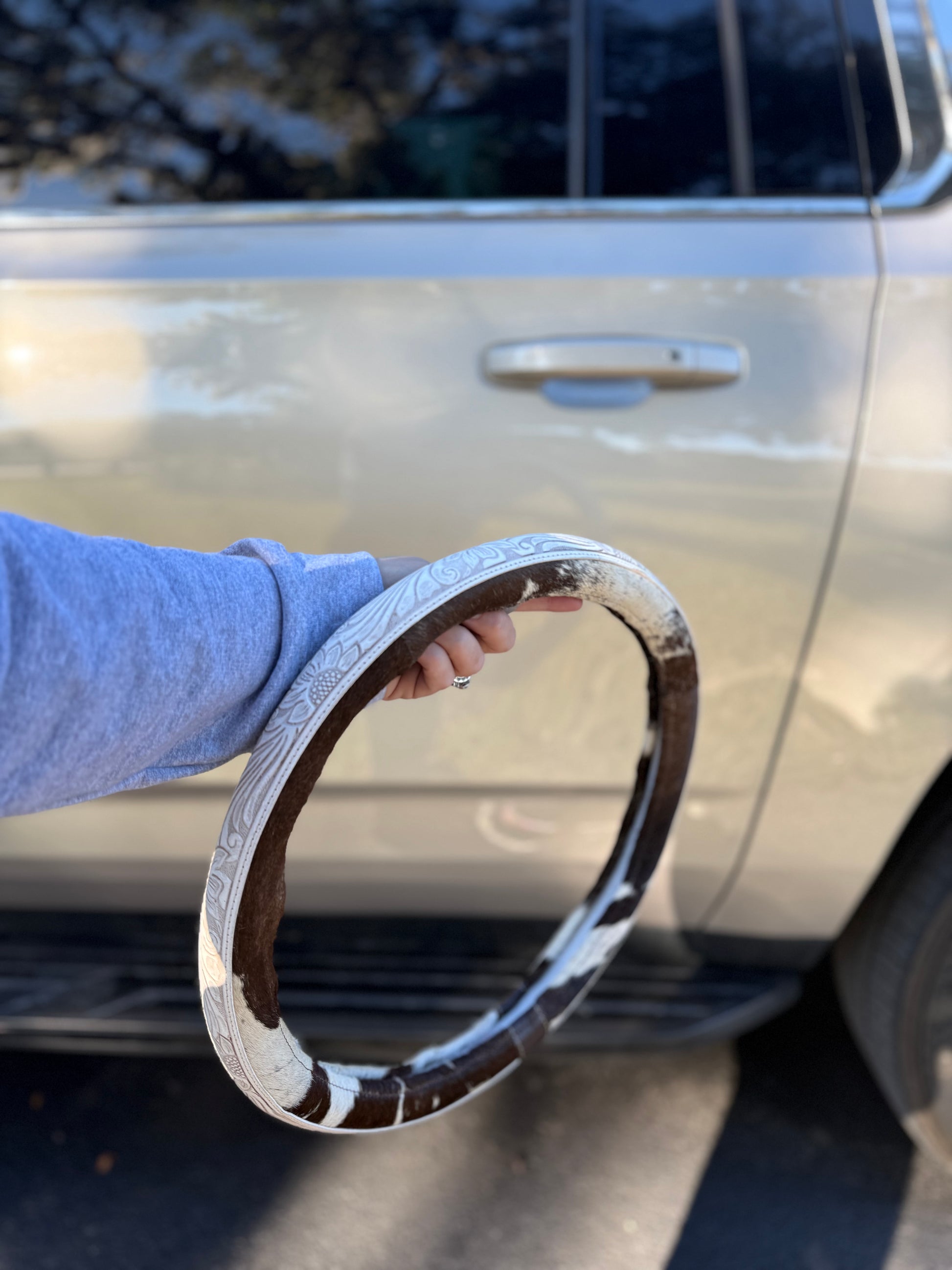 Bring rugged elegance to your vehicle with this one-of-a-kind cowhide leather steering wheel cover!